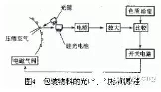 圖4為包裝物料的光電色質(zhì)檢測(cè)原理。若包裝物品規(guī)定底色為白色,因質(zhì)量不佳,有的出現(xiàn)泛黃,在產(chǎn)品包裝前先由光電檢測(cè)色質(zhì),物品泛黃時(shí)就有比較電壓差輸出,接通電磁閥,由壓縮空氣將泛黃物品吹出。