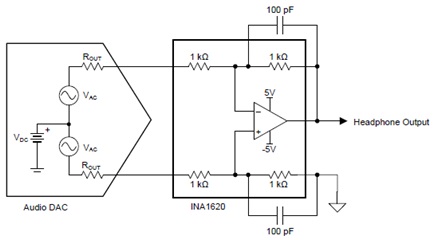 圖2.INA1620應(yīng)用電路:耳機(jī)放大器