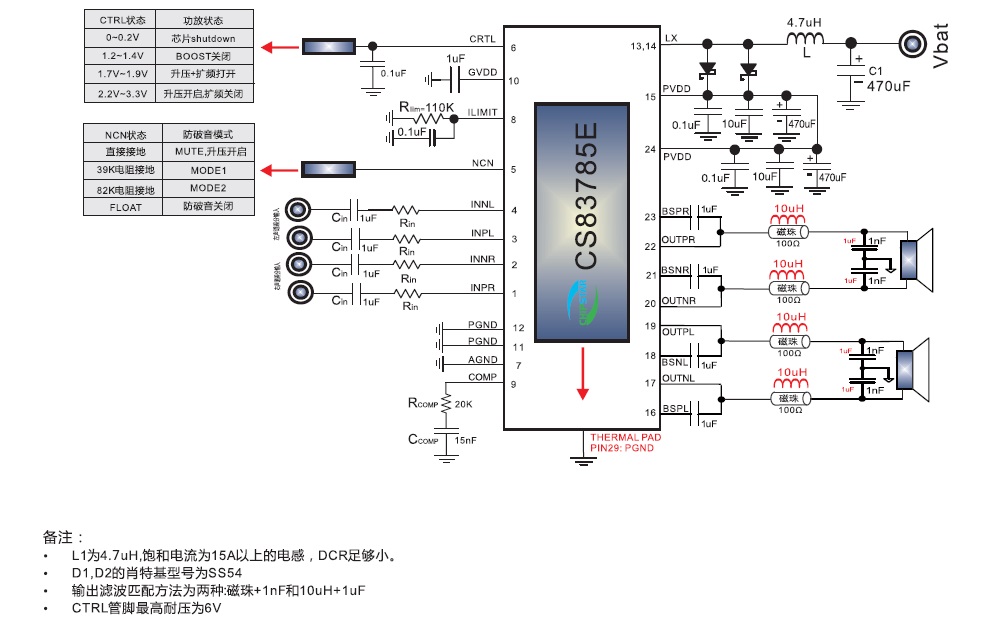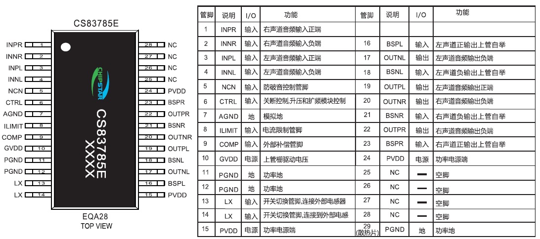 CS83785E是一款兼顧12V適配器供電應用針對單節(jié)鋰電應用 ,帶兩種防破音模式 ,擴頻模塊 ,內(nèi)置BOOST升壓模塊,R類立體聲音頻功率放大器?梢詾4Ω 的負載提供最高 2X10W的恒定功率.CS83785E管腳完全兼容CS83711E,為音頻子系統(tǒng)的功放設計以及終端產(chǎn)品的升級更換提供了可觀的功率裕量以及最大的便利性。CS83785E的全差分架構(gòu) 和極高的PSRR有效地提高了CS83785E對RF噪聲的抑制能力。無需濾波器的PWM調(diào)制結(jié)構(gòu)及內(nèi)置的BOOST升壓模塊,以及CS83785E采用專有的AERC((Adaptive Edge Rate Control)技術(shù) ,在音頻全帶寬范圍內(nèi)極大地降低了EMI的干擾,對60cm的音頻線,在FCC的標準下具有超過20dB的裕量,另外CS83785E內(nèi)置了過流保護,短路保護和過熱保 護,有效的保護芯片在異常的工作條件下不被損壞。
