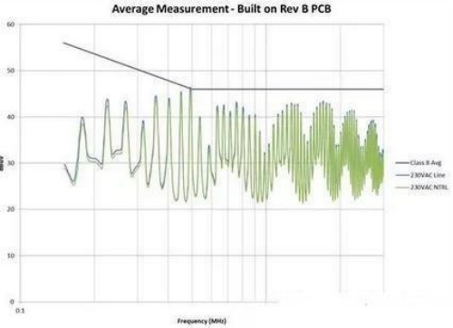圖 3:從電路板布局進(jìn)行 EMI 掃描,其中 AC 輸入與開關(guān)電路之間距離較大