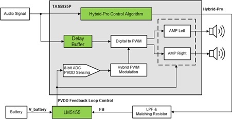 TAS5825P為德州儀器2019年新推出的數(shù)字輸入D類功放芯片。該芯片內置強大的音頻 DSP 內核,實現(xiàn)了一種稱為 Hybrid-Pro 的專有算法。Hybrid-Pro算法可檢測即將發(fā)生的音頻功率需求,并通過反饋引腳 (HPFB) 為DC/DC變換器提供 PWM 控制信號來調整輸出電壓(即D類功放的電源電壓 PVDD)。TAS5825P支持高達 4ms 的延遲緩沖器 (Delay Buffer),以提前查看音頻信號并防止音頻削波失真。
