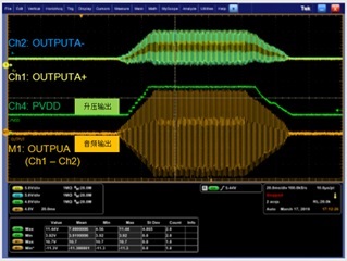 圖7. TAS5825P 實現(xiàn)實現(xiàn)動態(tài)調壓音頻功放的實驗波形