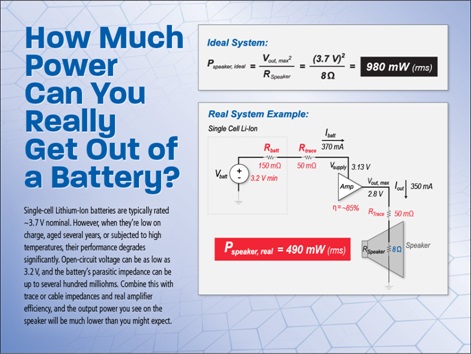 隨著設備尺寸變得越來越小,電源也隨之變小。鋰電池因其使用壽命長和充電時間短而備受歡迎。例如通過USB連接的5伏電源也是一種流行的標準。但是這些電源能提供響亮的音頻效率嗎?在大多數(shù)情況下,答案是否定的。例如,使用標準的3.7 V鋰離子作為電源,驅(qū)動典型8Ω揚聲器的高效放大器則提供不到1瓦的電能。當電池電量不足或電池老化時,電池電壓會降低,而電池阻抗則會增加2-3倍。如圖1所示,這將導致傳遞到揚聲器的輸出功率更少。為什么不只使用低阻抗揚聲器呢?因為這將不僅增加輸出功率,還會在放大器和揚聲器之間的走線或電纜上造成更高的負載電流和更大的功率損耗。(參見圖2)。