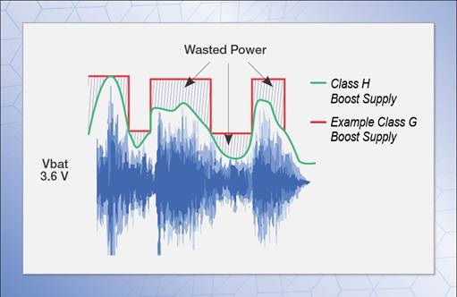 并非所有的升壓放大器都一樣。架構已發(fā)展演變?yōu)樵黾与妷、輸出功率和效率。G類配置提供兩個或三個不同的升壓輸出電壓電平。升壓轉(zhuǎn)換器會根據(jù)音頻內(nèi)容自動選擇所需的最小輸出電壓電平,以將轉(zhuǎn)換損耗降至最低。H類功放擁有更多級數(shù)的升壓電平,能夠細致地追隨包絡輸入音頻信號, 實現(xiàn)更高的效率(有關G類和H類升壓放大器的比較,請參見圖3)。即使在H類中,也并非所有升壓設計都是一樣的。重要的是要考慮升壓電壓跟蹤音頻包絡的速度和接近程度。例如,Cirrus Logic的CS35L41音頻放大器具有非常快速跟蹤的11V H類升壓轉(zhuǎn)換器。它也是首批采用55nm工藝的升壓放大器之一,與130nm或180nm等較大的模擬放大器工藝相比,它可以將很多工藝封裝在一個較小的區(qū)域內(nèi),實現(xiàn)更緊密、更快的升壓轉(zhuǎn)換器控制環(huán)路。