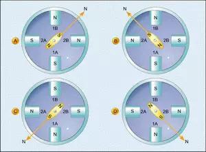現(xiàn)在假設(shè)我們構(gòu)造一個(gè)定子上纏繞有兩個(gè)繞組的電機(jī),內(nèi)置一個(gè)能夠繞中心任意轉(zhuǎn)動(dòng)的永久磁鐵,這個(gè)可旋轉(zhuǎn)部分叫做轉(zhuǎn)子。圖2給出了一種簡(jiǎn)單的電機(jī),叫做雙相雙極電機(jī),因?yàn)槠涠ㄗ由嫌袃蓚(gè)繞組,而且其轉(zhuǎn)子有兩個(gè)磁極。如果我們按圖2a所示方向給繞組1輸送電流,而繞組2中沒(méi)有電流流過(guò),那么電機(jī)轉(zhuǎn)子的南極就會(huì)自然地按圖中所示,指向定子磁場(chǎng)的北極。