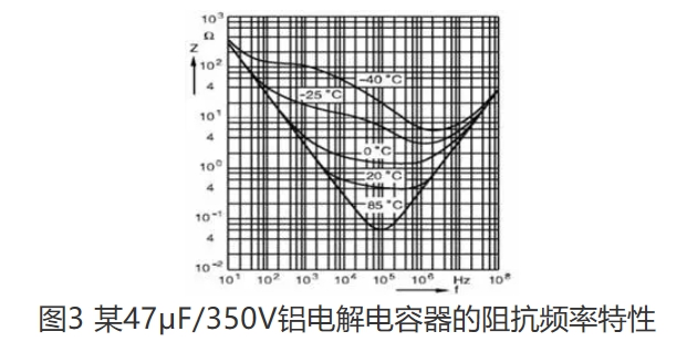 在開關(guān)電源輸出端用的濾波電容,與工頻電路中選用的濾波電容并不一樣,在工頻電路中用作濾波的普通電解電容器,其上的脈動電壓頻率僅有100Hz,充放電時間是毫秒數(shù)量級,為獲得較小的脈動系數(shù),需要的電容量高達(dá)數(shù)十萬微法,因而一般低頻用普通鋁電解電容器制造目標(biāo)是以提高電容量為主,電容器的電容量、損耗角正切值以及漏電流是鑒別其優(yōu)劣的主要參數(shù)。在開關(guān)穩(wěn)壓電源中作為輸出濾波用的電解電容器,由于大多數(shù)的開關(guān)電源工作在方波或矩形波的狀態(tài),含有及其豐富的高次諧波電壓與電流,其上鋸齒波電壓的頻率高達(dá)數(shù)十千赫,甚至數(shù)十兆赫,它的要求和低頻應(yīng)用時不同,電容量并不是主要指標(biāo),衡量它好壞的則是它的阻抗頻率特性,如圖3所示。