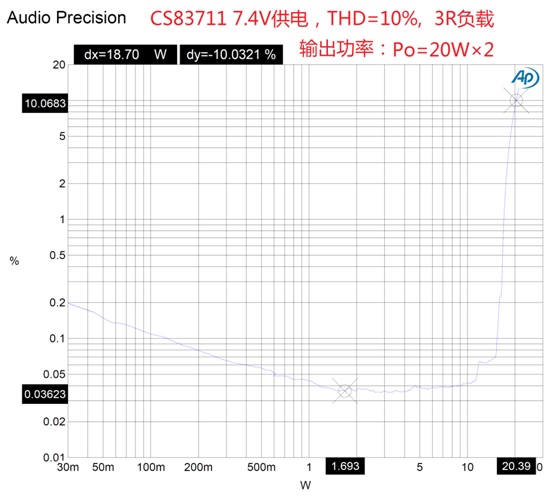 1. CS83711 7.4V供電對(duì)比普通音頻功放12V直供輸出功率,實(shí)測(cè)CS83711功率足2×20W。