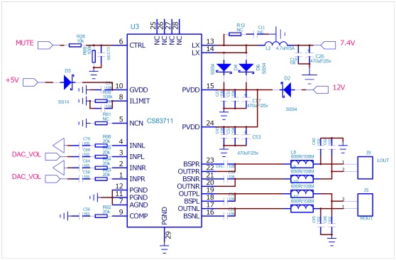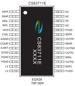 CS83711在7.4V鋰電池供電內(nèi)置升壓到11.05V,能提供2×20W/3歐峰值輸出功率。并且CS83711整體效率高達(dá)90%,保證了輸出功率恒定、整機(jī)要求的播放時(shí)間、以及溫升在正常范圍之內(nèi)。CS83711另一個(gè)亮點(diǎn)是可以支持外接12V電源直供,方便整機(jī)預(yù)留外置12V電源線夾接口。CS83711還有其他豐富的功能以及性能:兩種防破音可選、擴(kuò)頻模式、過(guò)流保護(hù)、短路保護(hù)、過(guò)熱保護(hù)等;簡(jiǎn)潔的EQA-28封裝生產(chǎn)也非常方便。