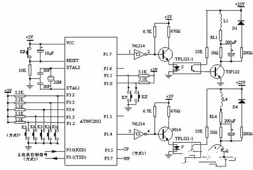 AT89C2051將控制脈沖從P1口的P1.4~P1.7輸出,經(jīng)74LS14反相后進入9014,經(jīng)9014放大后控制光電開關(guān),光電隔離后,由功率管TIP122將脈沖信號進行電壓和電流放大,驅(qū)動步進電機的各相繞組。使步進電機隨著不同的脈沖信號分別作正轉(zhuǎn)、反轉(zhuǎn)、加速、減速和停止等動作。圖中L1為步進電機的一相繞組。AT89C2051選用頻率22MHz的晶振,選用較高晶振的目的是為了在方式2下盡量減小AT89C2051對上位機脈沖信號周期的影響。