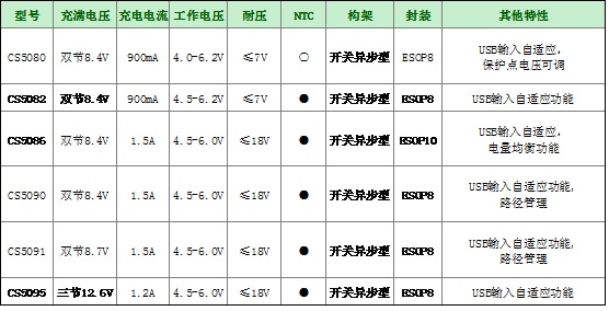USB_5V輸入用于兩節(jié)鋰電池串聯(lián)8.4V充電管理芯片:CS5080,CS5082,CS5086,CS5090;用于三節(jié)鋰電池串聯(lián)12.6V充電管理芯片:CS5095。每個型號全部具備輸入自適應(yīng)功能,任何大小電流的USB接口都可以正常充電,最大充電電流1.5A。另外,都具備完整的涓流,恒流,恒壓充電過程,各種安全可靠的保護(hù)措施以及充電狀態(tài)指示,大部分型號還帶了NTC溫度控制功能。CS5086還具備電量均衡功能,對電池的循環(huán)充電次數(shù)以及穩(wěn)定性大有提升。升壓型充電管理芯片適合應(yīng)用于藍(lán)牙音響、榨汁機、POS機、手持打印機、無人機、筋膜槍電動工具等產(chǎn)品領(lǐng)域,未來具備廣泛的市場前景。