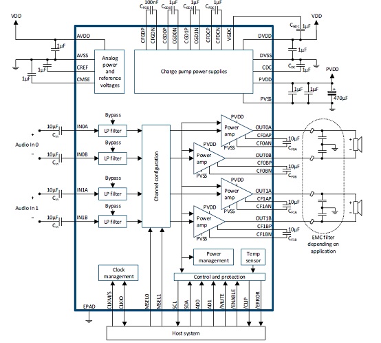 It contains a variety of digital/analog input, output and set-up/selection features. It also contains one on-board power supply (5 V buck converter), so only one external power supply (PVDD) is necessary.