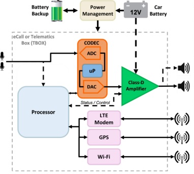 - 音頻信號(hào)路徑一般通過口頭電話將駕駛員連接到緊急服務(wù),因此大多數(shù)系統(tǒng)總共只需要一個(gè)通道。這意味著只需要一個(gè)麥克風(fēng)、一個(gè)ADC、一個(gè)DAC、一個(gè)D類功放和一個(gè)揚(yáng)聲器。