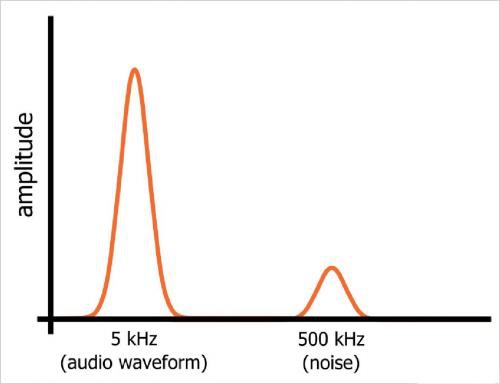 讓我們假設(shè)我們有一個由完美的 5 kHz 正弦波組成的音頻信號。我們知道時域中的正弦波是什么樣的,在頻域中我們只能看到 5 kHz 的頻率“尖峰”,F(xiàn)在讓我們假設(shè)我們激活一個 500 kHz 振蕩器,將高頻噪聲引入音頻信號。在示波器上看到的信號仍然只是一個電壓序列,每個時刻有一個值,但信號看起來會有所不同,因?yàn)樗臅r域變化現(xiàn)在必須反映 5 kHz 正弦波和高頻噪音波動。然而,在頻域中,正弦波和噪聲是在該一個信號中同時存在的單獨(dú)的頻率分量。正弦波和噪聲占據(jù)了信號頻域表示的不同部分(如下圖所示),這意味著我們可以通過將信號引導(dǎo)通過低頻并阻擋高頻的電路來濾除噪聲。