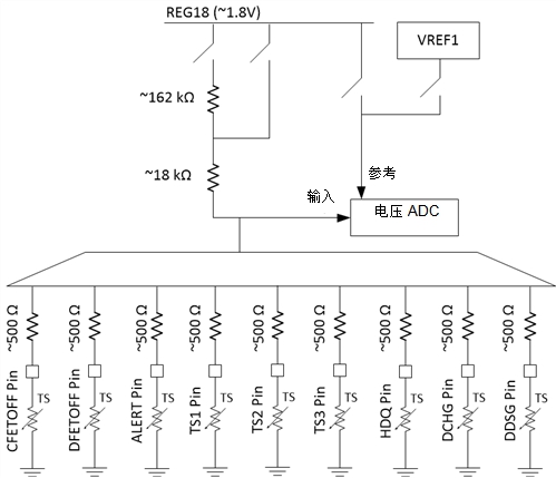 電壓ADC以REG18電壓為基準,按比例測量熱敏電阻引腳電壓。每個熱敏電阻上的電壓每隔一到三個測量循環(huán)測量一次。原始ADC計數(shù)值可通過DASTATUS6()子命令獲得。在正常模式下,器件每隔250ms將這些測量值轉換為溫度;在睡眠模式下,器件每隔一次測量將這些測量值轉換為溫度。