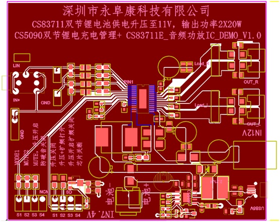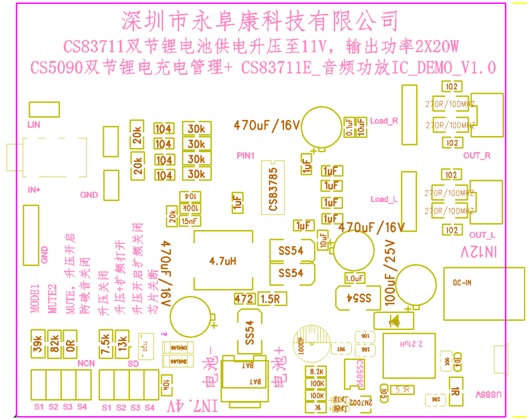 - 采用CS83711功放IC,該芯片6V-9V供電內(nèi)置升壓11V提供2*16W/4歐功率輸出;