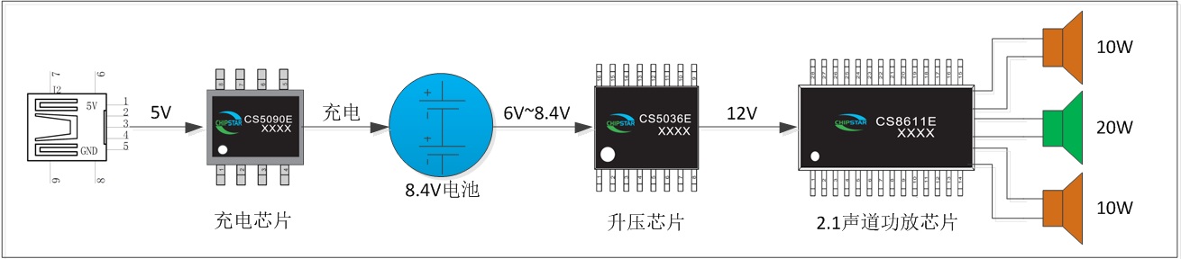 深圳市永阜康科技有限公司推出基于CS8611E單芯片移動(dòng)2.1聲道藍(lán)牙音箱解決方案。采用雙節(jié)鋰電池串聯(lián)8.4V做電源,再加一個(gè)升壓芯片CS5036E升壓到12V給CS8611E供電,實(shí)現(xiàn)20W+2×10W輸出;而充電采用CS5090E USB 5V輸入兩節(jié)鋰電池串聯(lián)8.4V充電管理芯片,非常方便。在鋰電池為電源的狀態(tài)下提供媲美傳統(tǒng)2.1音箱的聽覺體驗(yàn)。