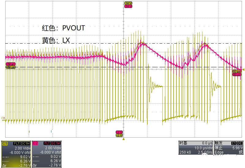 加大陶瓷電容有改善,PVOUT上的陶瓷電容從22uF改為44uF后不再震蕩。