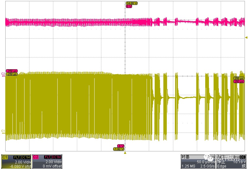 一個(gè)RC的時(shí)間是465ms,所以容量是對的。但是重點(diǎn)來了,電容充電的起始點(diǎn)發(fā)現(xiàn)異常,不是從0開始,而是有一個(gè)固定的電壓。這個(gè)極有可能是電解電容已經(jīng)損壞,或者內(nèi)部寄生阻抗太大,甚至達(dá)到了100歐的級別,導(dǎo)致環(huán)路出現(xiàn)了不穩(wěn)定,震蕩。