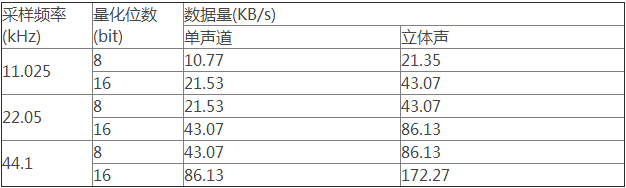 音頻數(shù)據(jù)量=采樣頻率&TImes;量化位數(shù)&TImes;聲道數(shù)/8(字節(jié)/秒)