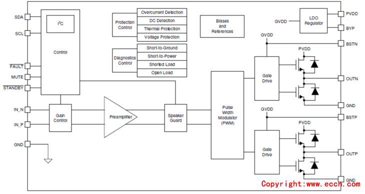 battery. The wide operating voltage range and excellent efficiency make the device ideal for startstop support or running from a backup battery when required. The integrated load-dump protection reduces external voltage clamp cost and size, and the onboard load diagnostics report the status of the speaker through I2C.