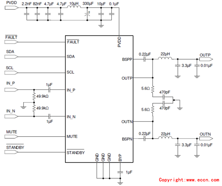 TI公司的TAS5441-Q是單路D類音頻放大器,能從14.4Vdc汽車電池向4 Ω負載提供THD+N小于10%的高達22W功率.滿足 AEC-Q100汽車規(guī)范,工作電壓4.5V到18V, 4 Ω負載時的效率85%,差分模擬輸入,75dB電源抑制比例(PSRR),具有負載診斷功能如開路和短路輸出負載,輸出對電源和輸出對地短路.保護和檢測功能包括有短路保護,40V負載突降保護per ISO-7637-2,播放音樂時輸出DC電平檢測,超溫保護以及過壓和欠壓保護.主要用在汽車緊急呼叫(eCall)放大器,汽車通訊系統(tǒng),儀表盤系統(tǒng)和信息娛樂音頻.本文介紹了TAS5441-Q主要特性,功能框圖,應用電路,評估板TAS5441-Q1 EVM主要特性,電路圖,材料清單和PCB設計圖.