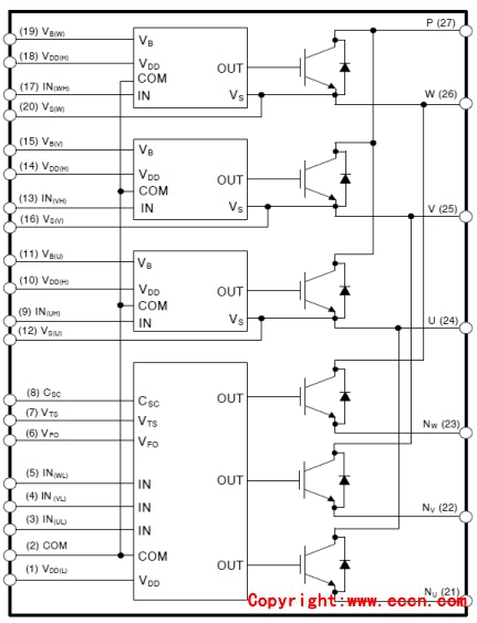 下圖是ON適用于汽車650V智能功率模塊,它分為30A、40A、50A電流等級,本文主要針對50A的版本作介紹。IPM是一款先進(jìn)的汽車SPM模塊,為混合動力汽車和電動汽車提供全功能,高性能的逆變器輸出。模塊集成了內(nèi)置IGBT優(yōu)化的柵極驅(qū)動,可最大限度地降低EMI和損耗,同時還提供多種模塊內(nèi)保護(hù)功能,包括欠壓鎖定,過流關(guān)斷,驅(qū)動IC熱監(jiān)控和故障報告。內(nèi)置的高速HVIC僅需要一個電源電壓,并將輸入的邏輯電平柵極輸入轉(zhuǎn)換為正確驅(qū)動模塊內(nèi)部IGBT所需的高電壓、高電流的驅(qū)動信號,內(nèi)部結(jié)構(gòu)如圖2所示。