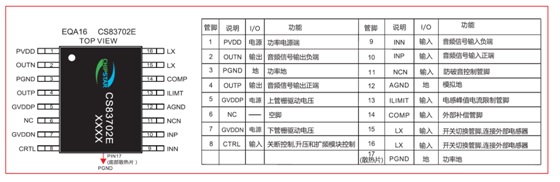 CS83702工作電壓范圍是2.7V~5.5V,采用EAQ16封裝,尺寸大小與ESOP-8一致;針對不同的應(yīng)用場合、不同的喇叭腔體需求、CS83702內(nèi)置三種防破音模式可選,靈活方便;另外擴(kuò)頻工作模式在整機(jī)EMI認(rèn)證測試時變得很輕松;AB/D類切換免除收音干擾;CS83702除了性能指標(biāo)優(yōu)秀、音質(zhì)表現(xiàn)突出、應(yīng)用簡單靈活之外,還有著完善的保護(hù)機(jī)制,包括過流保護(hù)、過熱保護(hù)、輸出短路保護(hù)等,實(shí)測輸出正負(fù)兩端短路、輸出對地短路、輸出對電源短路保護(hù)功能準(zhǔn)確無誤。