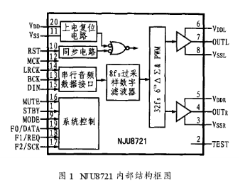 NJU8721芯片內(nèi)含上電復(fù)位電路、同步電路、串行音頻數(shù)據(jù)接口、控制電路、8f。過采樣數(shù)字濾波器、6階32fsΔ-∑與PWM電路以及左/右聲道輸出級等電路,圖1所示是其內(nèi)部結(jié)構(gòu)框圖。