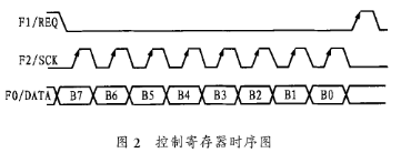 當(dāng)控制模式選擇在串行控制時,可用控制寄存器設(shè)定各種模式?刂茢(shù)據(jù)將從F2/SCK的上升沿引入,同時在Fl/REQ的上升沿被置位并進入控制寄存器。在F1/REQ上升脈沖到來之前,最后8位數(shù)據(jù)有效。圖2為控制寄存器的時序圖。