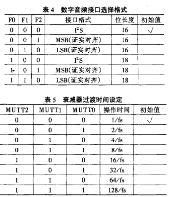F0、F1、F2與FO/DATA、F1/REQ、F2/SCK腳的控制方法相同,其主要作用是選擇數(shù)字音頻接口格式,具體操作如表4所列。