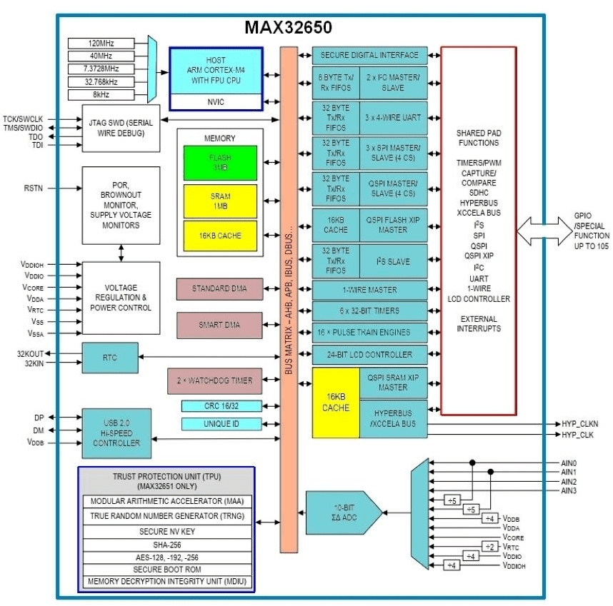圖 3:Maxim Integrated 的 MAX32650 基于 120 MHz Arm Cortex-M4F,具有面向高性能物聯(lián)網(wǎng)邊緣計算應用的全系列外設(shè)和存儲器選項。(圖片來源:Maxim Integrated)