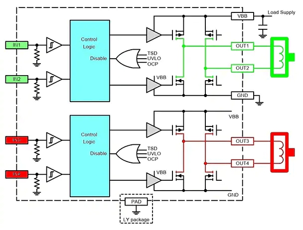 A3909 具有熱關(guān)斷保護、過流保護和短路保護功能。每個輸入 (INx) 驅(qū)動相應的輸出 (OUTx)。MAX32650 PWM 可以將脈沖串輸出 0 和 1 連接到輸入 IN1 和 IN2(綠色),以通過 OUT1 和 OUT2 驅(qū)動綠色線圈,以及將脈沖串輸出 2 和 3 連接到 IN3 和 IN4(紅色),以通過 OUT3 和 OUT4 驅(qū)動紅色線圈。這使 A3909 能夠直接驅(qū)動步進電機。