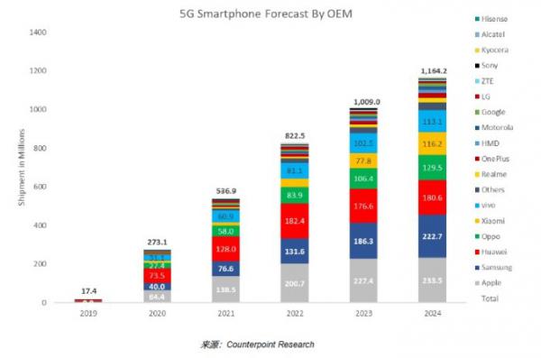 圖1:各廠商5G智能手機(jī)出貨量預(yù)測(來源:Counterpoint Research)
