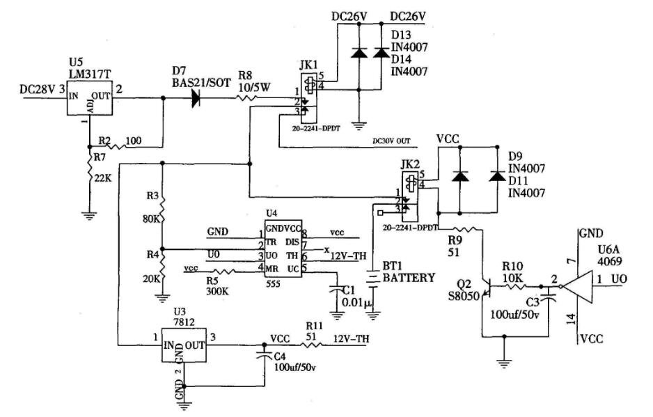 這個電路的結(jié)構(gòu)比較簡單,使用一個片常用的電壓比較器芯片-LM393。這是一個雙電壓比較器芯片,在這個電路中使用了其中的一片。這個電路的工作原理是:蓄電池除了給負載部分供電外,還會給這個電路提供電源。電壓比較器的同相輸入端由電阻R2通過穩(wěn)壓二極管穩(wěn)壓,經(jīng)過電阻R3提供基準電壓,同時蓄電池電壓會經(jīng)過電阻R1以及可變電阻VR1的分壓輸入到電壓比較器的反相輸入端,這一路作為電池電壓的檢測,通過調(diào)節(jié)VR1使電壓在放電保護電壓。正常工作時,反相輸入端的電壓會高于同相輸入端,比較器的輸出端會輸出低電平,驅(qū)動外接的PNP三極管導通,繼電器線圈得電工作,常開觸點閉合,蓄電池會給負載供電。