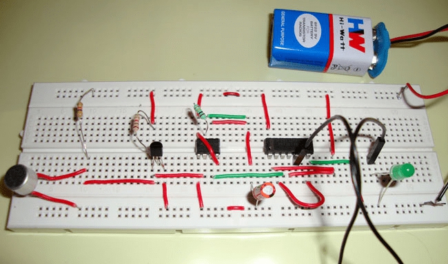 我們使用電容麥可分來(lái)感知聲音,三極管來(lái)觸發(fā)555定時(shí)器,而555定時(shí)器來(lái)設(shè)置和重置D觸發(fā)器,而D觸發(fā)器來(lái)則用于記憶下一次拍手/聲音之前的邏輯電平(LED打開(kāi)或關(guān)閉)。