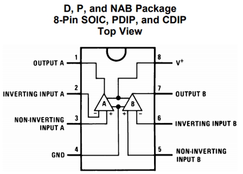 該設(shè)計加入了可調(diào)的過流閾值,同時還有失效時自動重啟功能。因為這是一個基于運放的過流保護電路,所以我們加入了運放作為驅(qū)動,這里用的是常見的LM358。下圖為LM358的引腳圖。