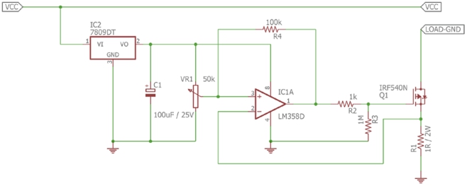 可以從上述電路圖看出,MOSFET IRF540N在正常與過流情況下控制負(fù)載的連接與關(guān)斷。但在關(guān)閉負(fù)載之前,檢測到負(fù)載電流很重要。而用于檢測電流的方法就是通過分流電阻R1,這是一個1Ω 2W的分流電阻。其測量電流方法被稱為分流電阻檢流。