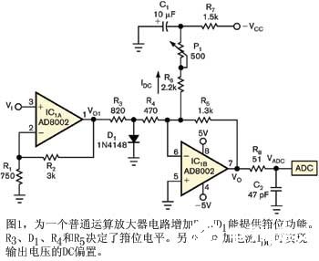 許多快速ADC都推薦0.6V“2.6V輸入電壓范圍,如美國國家半導體公司的ADC1175(參考文獻1)。但在某些應用中,必須要轉(zhuǎn)換一個對稱的模擬輸入信號。本設計實例中的電路將一個-0.2V ” +0.2V范圍的對稱輸入電壓轉(zhuǎn)換到推薦的0.6V“2.6V范圍(圖1)。該電路亦能防止輸出電壓低于-0.3V,以防止損壞ADC。