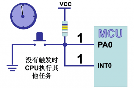問題出在去檢測 I/O 口這個(gè)過程,CPU 必須每隔一段時(shí)間檢測,一般用定時(shí)器去實(shí)現(xiàn),間隔時(shí)間太長了達(dá)不到實(shí)時(shí)的性能,時(shí)間太短了有浪費(fèi) CPU 資源,因?yàn)樵诤芏鄨龊习存I處于觸發(fā)的時(shí)間段時(shí)相當(dāng)少的,比如學(xué)校的自動圈存機(jī),一般情況下時(shí)沒人用的,那就意味著 CPU 每間隔時(shí)間去查看 I/O 是非常不合理的,只有當(dāng)按鍵按下采取查看,這才是 合理的方式。