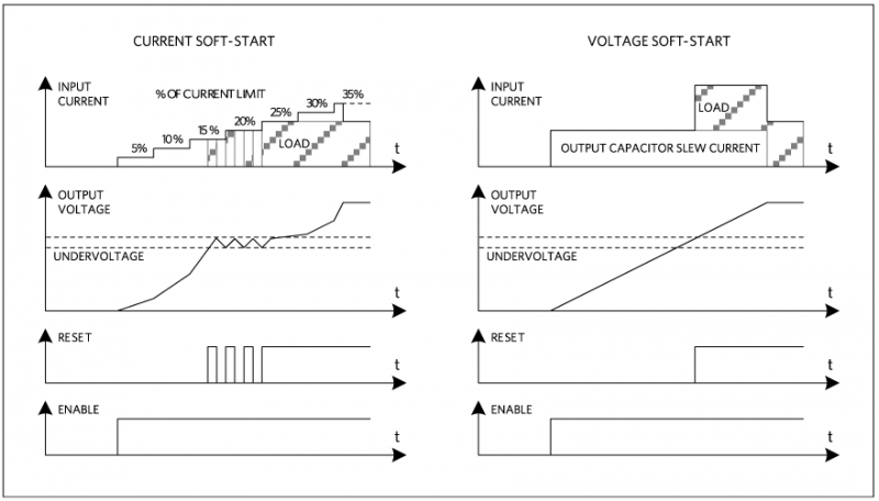 種方法是電流軟啟動。大多數(shù)穩(wěn)壓器具有電流限值;電流軟啟動是緩升或步進(jìn)到該電流限值。由于輸出電容充電量遠(yuǎn)遠(yuǎn)小于 負(fù)載電流,軟啟動使得輸出電壓緩慢上升。電流軟啟動的優(yōu)點(diǎn)是穩(wěn)壓器輸入電流穩(wěn)定上升,不會將負(fù)載啟動的瞬態(tài)電流傳遞到輸入。