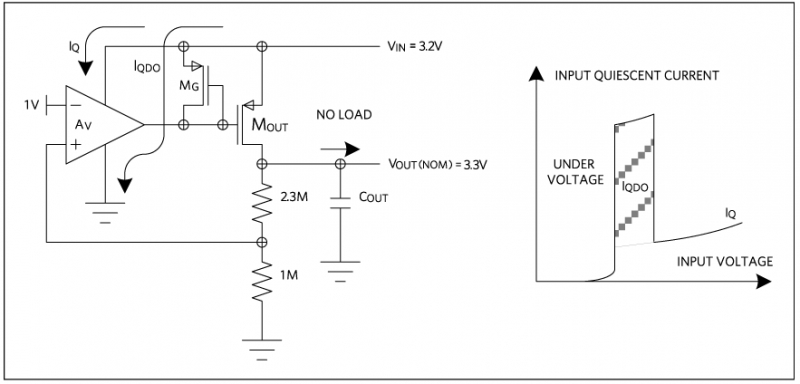 假設(shè)隨著電池電量的消耗,使得輸入與輸出之間的壓差達(dá)到很小的狀態(tài)。此時(shí)的線性穩(wěn)壓器,即使負(fù)載電流非常小,也會強(qiáng)制 FET 導(dǎo)通, 地減小輸入與輸出之間的壓降。工作在 壓差時(shí)的潛在問題是,驅(qū)動穩(wěn)壓器輸出 FET 的柵極驅(qū)動電路將消耗較大電流(圖 2)。使得“待機(jī)模式”變?yōu)椤半姵乜焖俜烹娔J健薄?/font>