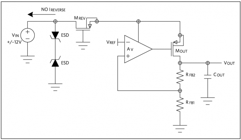 反向電壓保護(hù)允許輸入引腳電壓低于地電位,不會吸收顯著電流。為達(dá)到這一目的,需要通過串聯(lián)開關(guān)將輸出 FET 的體二極管斷開。大多數(shù)穩(wěn)壓器都包括二極管,防止任何引腳電壓低于地電位,防止引腳發(fā)生靜電放電,即 ESD。為實(shí)現(xiàn)反向電壓保護(hù),也需要去除該二極管的影響,并采取不同的保護(hù)器件,參見(圖 6)。