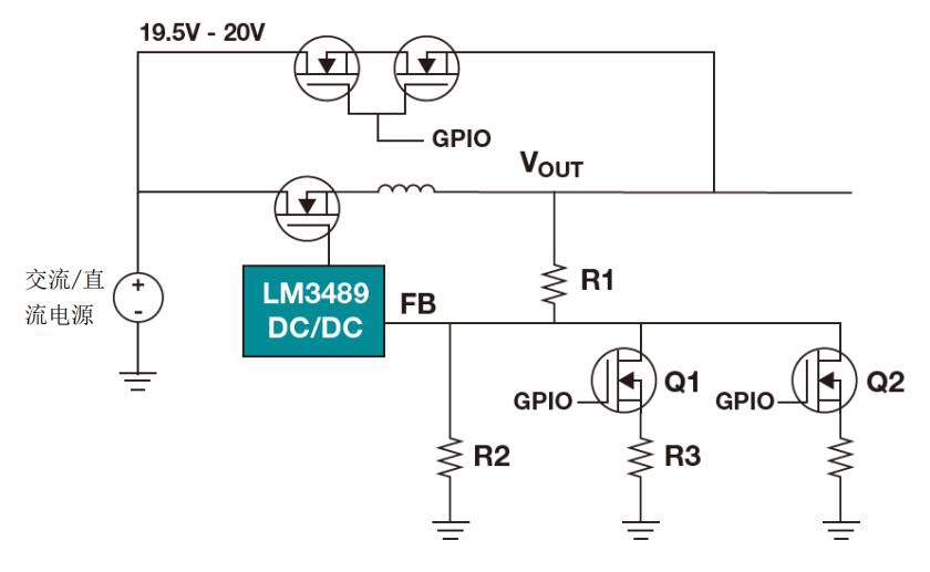 對于這個具體的設計示例,我會使用 TI 的 LM3489 磁滯 p 溝道 FET(PFET)控制器。該集成電路(IC)允許外部 PFET 上 100%的占空比,可直接從 AC/DC 轉換器通過外部 19.5 V。市場上大多數(shù) USB PD 控制器都具有通用輸入/輸出(GPIO),用于控制外部穩(wěn)壓器輸出電壓。PD 控制器可以通過調(diào)節(jié)降壓的反饋網(wǎng)絡來調(diào)整 LM3489 DC/DC 降壓轉換器的輸出電壓。