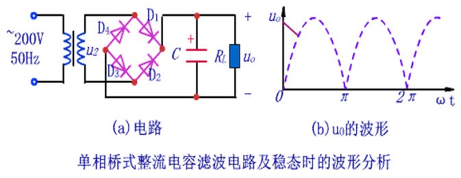 濾波電容容量大,因此一般采用電解電容,在接線時(shí)要注意電解電容的正、負(fù)極。電容濾波電路利用電容的充、放電作用,使輸出電壓趨于平滑。