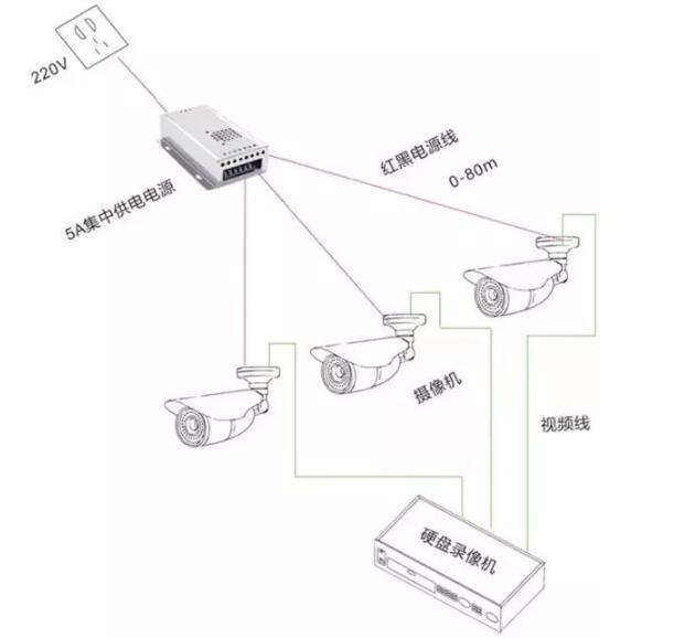 通常懂的人都知道集中供電模式是在 220V 電源處接 12V 集中電源一個(gè),再用 2*1.0 紅黑電源線分別接給攝像頭,12V 供電距離不可超過 100 米。在接個(gè)單個(gè)電源線接頭,再把單個(gè)電源線接頭和監(jiān)控?cái)z像頭電源接頭相連接即可。集中供電方式是指在監(jiān)控室或某個(gè)中間點(diǎn)采用 12V 開關(guān)電源向前端負(fù)載集中供電。與獨(dú)立供電模式相比,最大的差別在于一個(gè)電源可以為多個(gè)攝像機(jī)提供電力供應(yīng)。