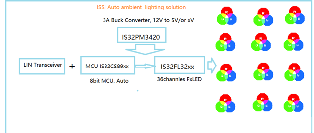 如下圖Lumissil驅(qū)動(dòng)多路RGB氛圍燈系統(tǒng)所示,系統(tǒng)采用汽車級(jí)高壓3ABuck恒壓驅(qū)動(dòng)芯片IS32PM3420提供5V電源電壓,采用汽車級(jí)MCU IS32CS89xx 控制各種燈效LED驅(qū)動(dòng)芯片來(lái)驅(qū)動(dòng)多顆 RGBLED (多達(dá)12或6顆RGB),從而使整體系統(tǒng)成本將大大降低,而且也只占用一個(gè)LIN地址。