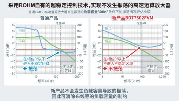 新產(chǎn)品采用ROHM自有的電源技術(shù)“Nano Cap™”,實(shí)現(xiàn)了非常穩(wěn)定的控制,不僅支持異常檢測(cè)系統(tǒng)等所要求的高速放大(轉(zhuǎn)換速率高達(dá)10V/µs),而且是不會(huì)因布線等的負(fù)載容量而發(fā)生振蕩的運(yùn)算放大器。普通的高速運(yùn)算放大器會(huì)因布線等的負(fù)載容量而變得不穩(wěn)定,而且受布線和外圍部件的限制非常難以處理。而本產(chǎn)品可在不發(fā)生振蕩的狀態(tài)下穩(wěn)定工作,非常有助于縮減應(yīng)用的設(shè)計(jì)工時(shí)。
