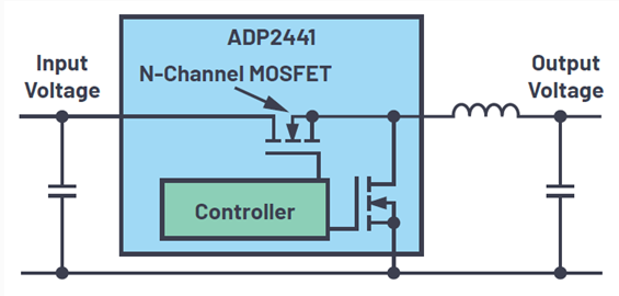 圖 3 所示為開關穩(wěn)壓器 ADP2370,該穩(wěn)壓器通過將 P 通道 MOSFET 用作高壓側開關來實現(xiàn) 100%占空比。對于這種類型的降壓轉換器,輸入電壓可以降低至非常接近輸出電壓。將 P 通道開關集成到開關穩(wěn)壓器中,可以避免產(chǎn)生額外成本。