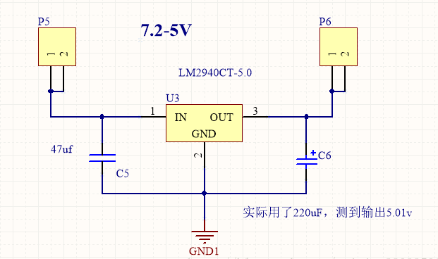7.2v轉(zhuǎn)5v也很常見,一般直接用lm2940,電路如下: