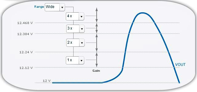 在圖3的示例中,設(shè)置的標(biāo)稱輸出電壓為12 V?烧{(diào)控制環(huán)路增益可以設(shè)置為多個(gè)值,具體由輸出電壓決定。例如,如果因?yàn)檎`差放大器的增益增加,使得電壓升高至12.12 V以上,則可以在對應(yīng)的下拉菜單中設(shè)置控制環(huán)路。還有三個(gè)其他的電壓閾值高于12.12 V,可以使用獨(dú)立的增益設(shè)置。注意,這些增益設(shè)置與在設(shè)計(jì)穩(wěn)壓環(huán)路時(shí)設(shè)置的極點(diǎn)和零完全無關(guān)。